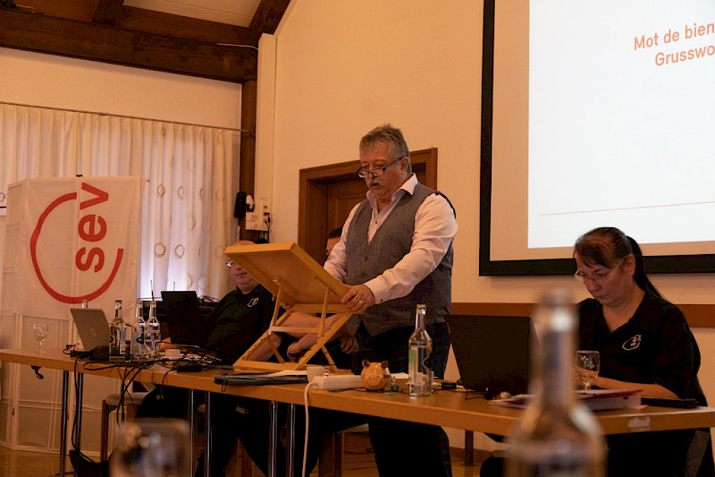 Kurz vor der Mittagspause heitert der humorvolle Auftritt von Matthias Hartwich die Runde auf. Der künftige SEV-Präsident steht vor seiner Wahl am nächsten Tag Red und Antwort und verdeutlicht, dass für ihn der Präsident des SEV der «Erste Gewerkschaftssekretär» der Organisation ist. Wichtig seien ihm insbesondere der Dialog – er will stets ein offenes Ohr haben für die Anliegen und Sorgen der Kolleg:innen – Solidarität und Transparenz.